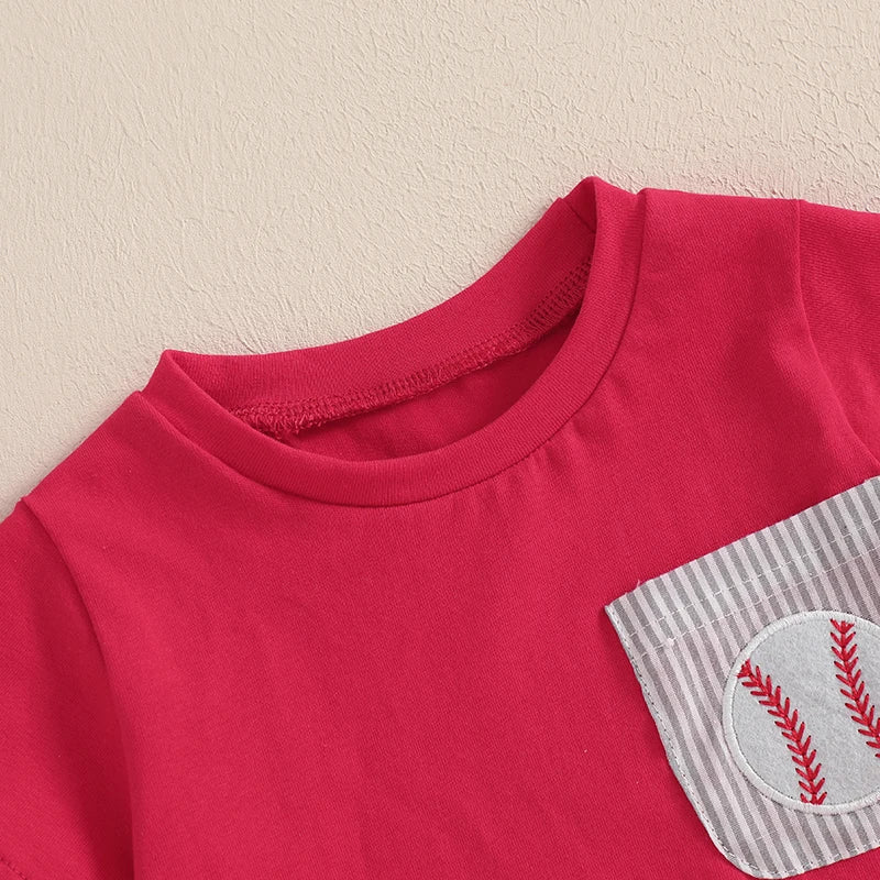This baseball-themed set includes a red shirt and gray shorts, perfect for keeping your little one comfortable and stylish during summer playtime.