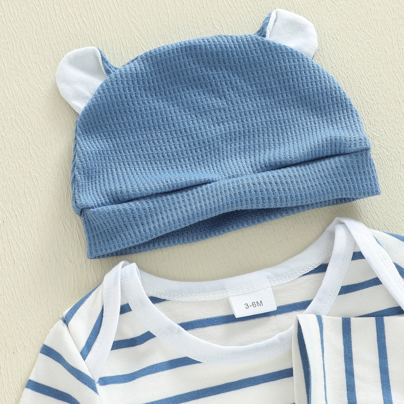 Dress your little one in autumn charm with this delightful three-piece set! The striped romper pairs perfectly with cozy blue overalls featuring an adorable elephant design, while the matching blue beanie keeps things snug and stylish. Every piece works together to create an effortlessly cute look that's perfect for cooler weather.