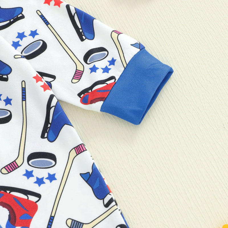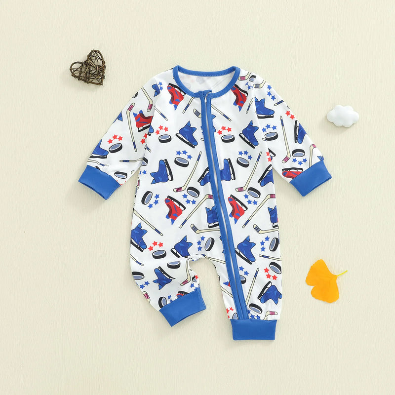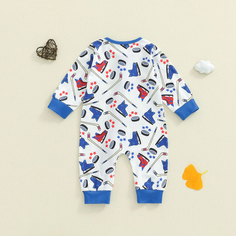 This charming jumpsuit features playful hockey prints, making it perfect for game day or crisp fall outings. Soft and cozy, it keeps your little one snug while adding a fun, sporty flair to their outfit. Combining warmth and style, this jumpsuit is sure to be a favorite for a playful look.