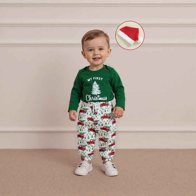 Celebrate your little one’s first holiday in style with this charming baby boy set. Featuring a green romper paired with white pants adorned with festive red trucks and trees, it creates an adorable and cozy look perfect for the season.
