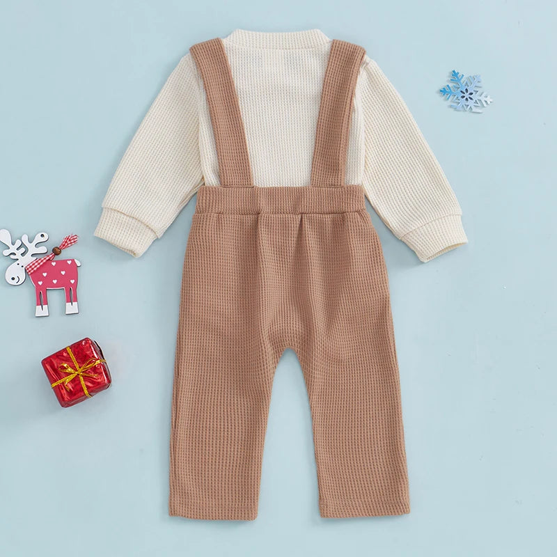 With charming embroidered Santa deer and classic suspender pants, this outfit keeps your child looking adorable and feeling cozy. Ideal for holiday celebrations, it combines cuteness and comfort in one delightful package - a festive choice for your little one this Christmas.