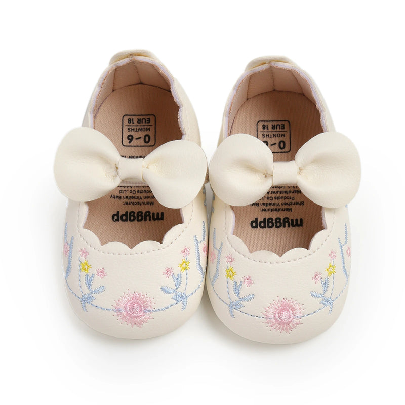 A charming blend of comfort, sweetness, and style with its delightful bowtie detail and delicate embroidered florals. These shoes support little feet with a cozy fit while making every step feel special.