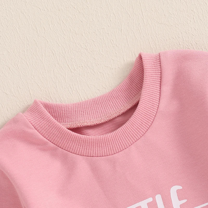 This charming set features a cozy pink sweatshirt paired with a stylish checkers sweatpants, ideal for keeping any little sister comfortable and warm during cooler days and joyful playtime.