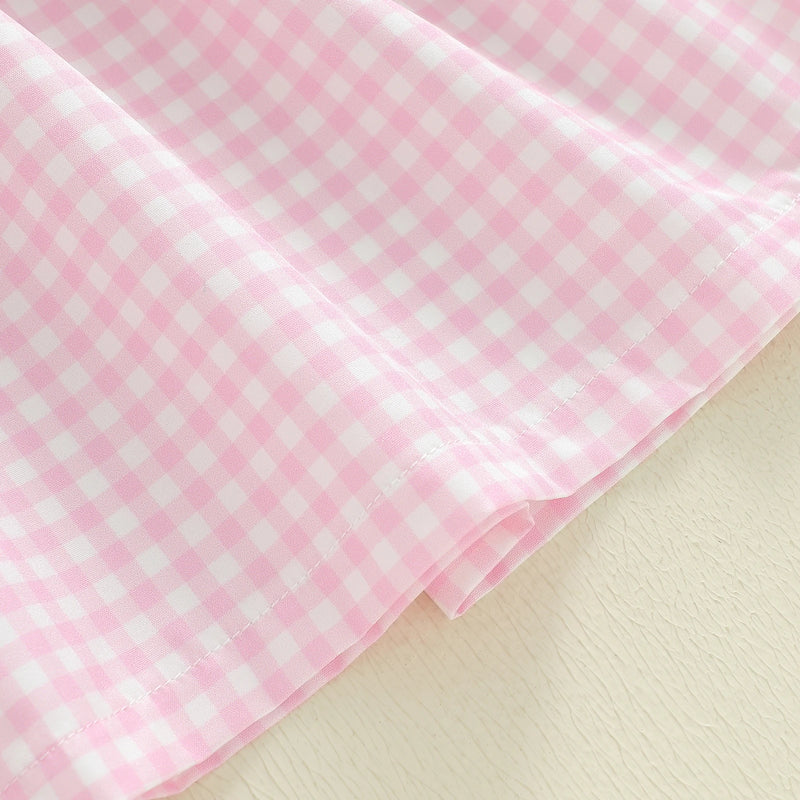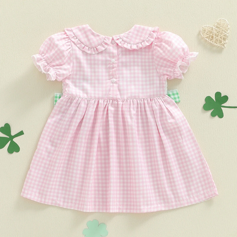 A delightful pink checkered dress featuring cute bowtie details and an embroidered shamrock perfect for expressing your baby girl's style with charm and confidence.