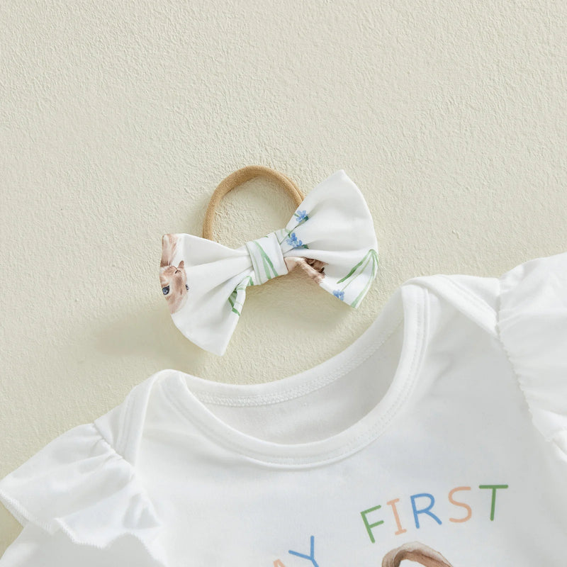 Introduce your little one to Easter in style with this adorable white outfit, perfectly designed for her first celebration. Featuring a charming bow detail and sweet bunny prints, this cozy set combines comfort with festive charm. An ideal choice for photos, family gatherings, and creating those precious first Easter memories.