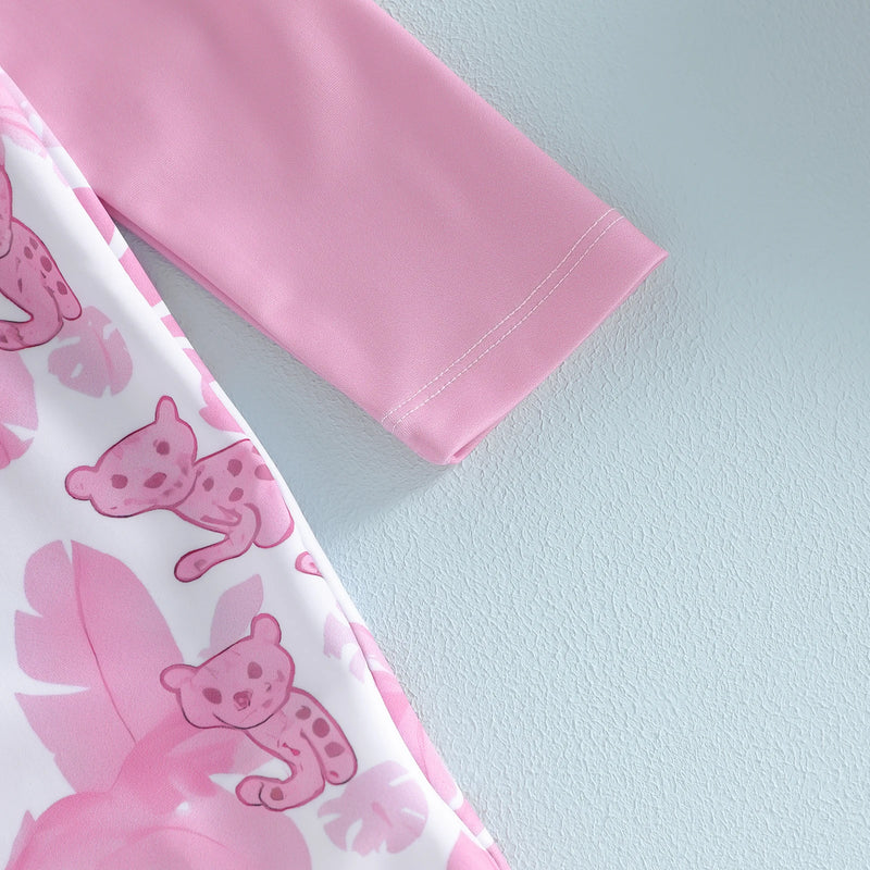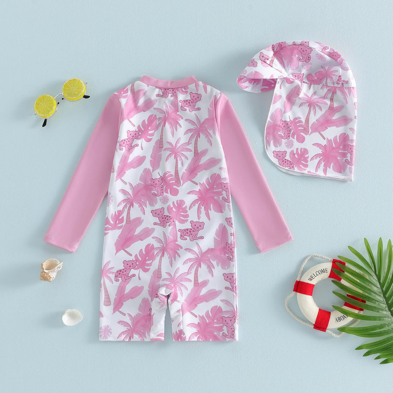 Make a splash in style with our PINK PARADISE long sleeve swimsuit, featuring a vibrant tropical print that brings vacation vibes to every swim session. The protective long sleeves offer extra sun coverage, keeping young swimmers comfortable and safe in the water. Paired with a matching sun hat, this coordinated set ensures head-to-toe sun protection while maintaining that fun, tropical aesthetic.