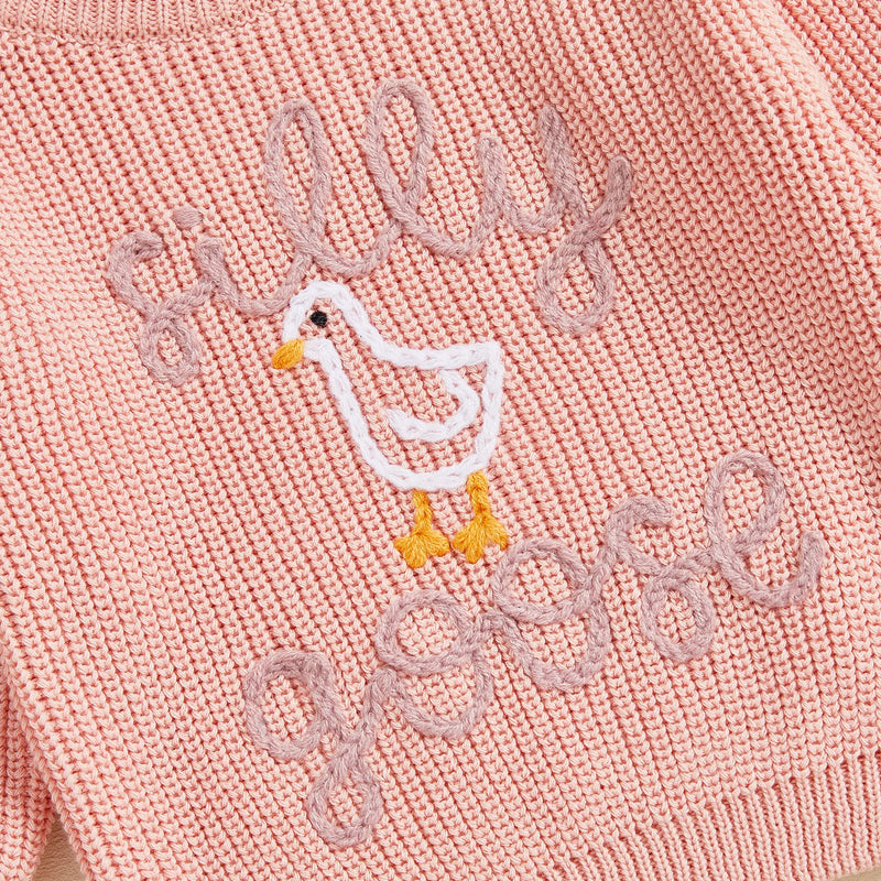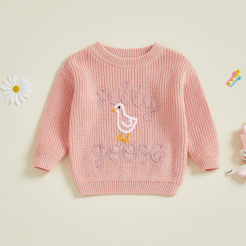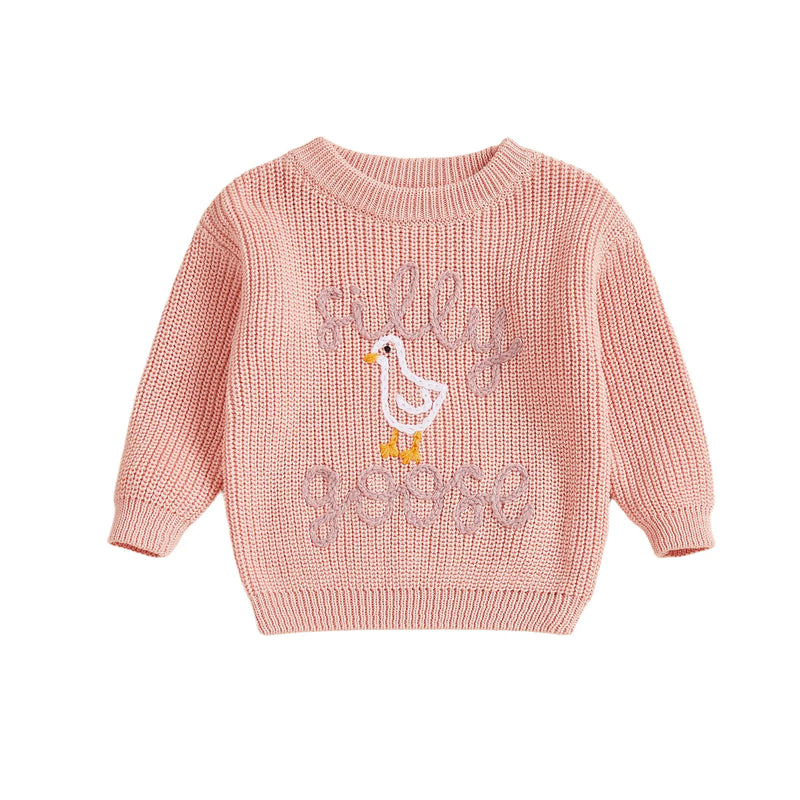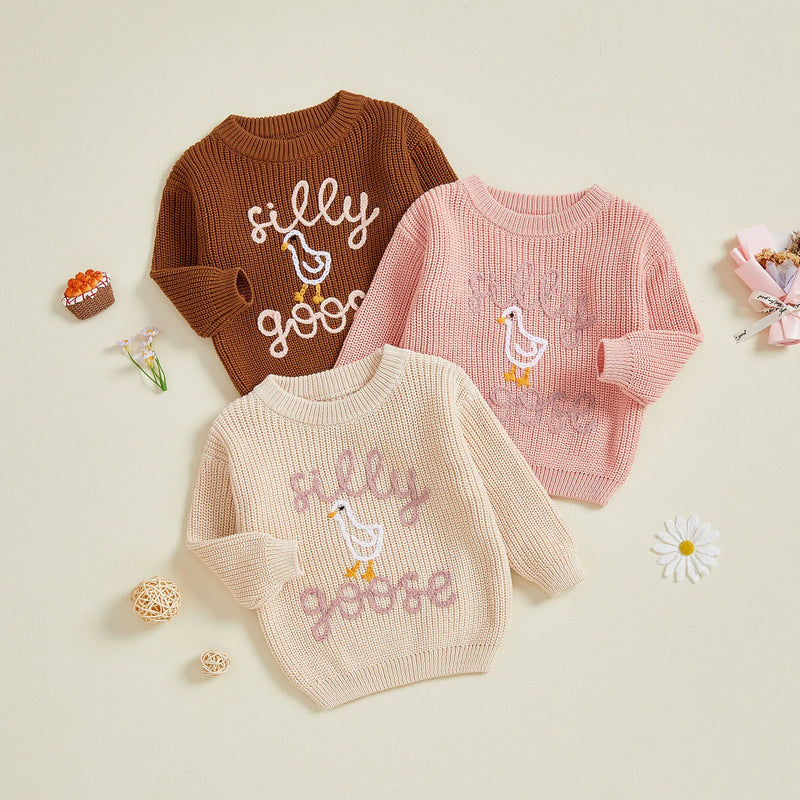Keep your silly little one cozy and stylish with our soft and comfy knitted sweater. Topped with a whimsical embroidered silly goose, it’s the perfect way to add a dash of fun to any outfit. Watch them waddle through their day with smiles and warmth!