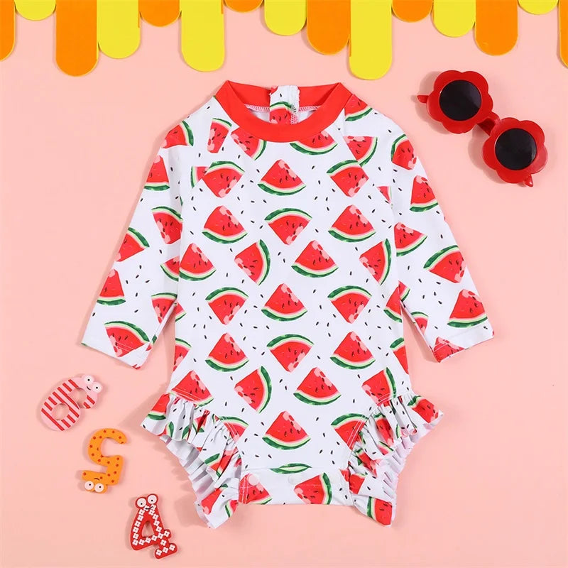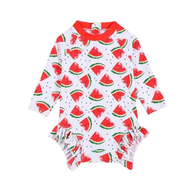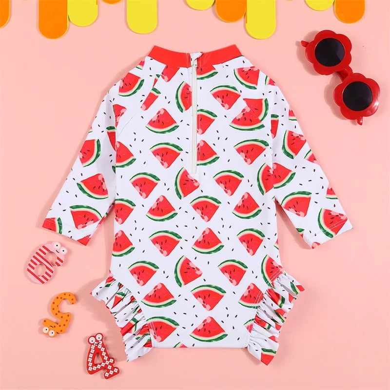 TILLY is a thoughtfully designed long-sleeve swimsuit that supports your daughter's confidence in the water. Featuring adorable watermelon prints and delicate pink ruffles, this suit combines style with practical sun protection, allowing her to play freely at the beach or pool without worry.