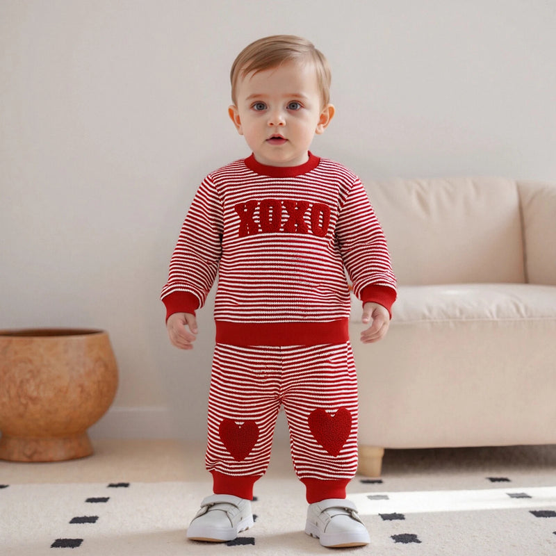 Celebrate your baby girl's love for you in this charming striped outfit with embroidered hearts and "xoxo" details. Ideal for Valentine's Day and everyday wear that makes her feel special.
