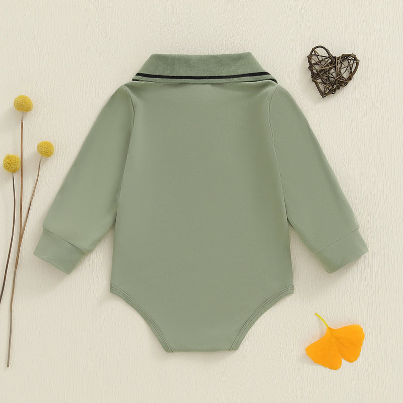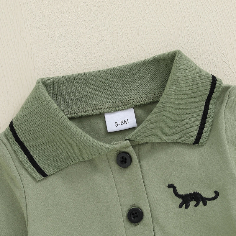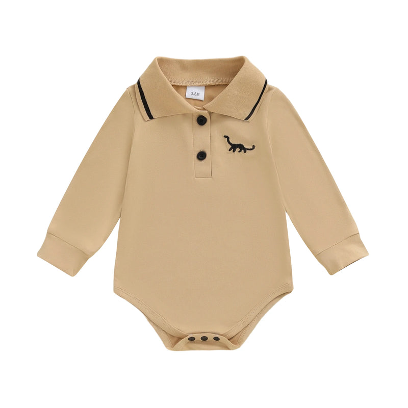 A cozy long-sleeve polo onesie with a cute embroidered dinosaur, perfect for fun and comfort all day.