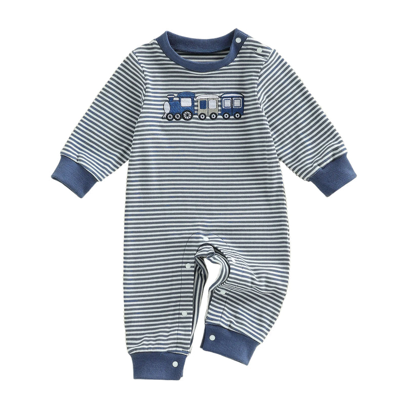 Let your tiny adventurer make a statement in this charming striped jumpsuit, complete with a delightful embroidered train design. Perfect for fall outings, it combines comfort with undeniable style, keeping him looking sharp and feeling great from morning playtime through evening cuddles.