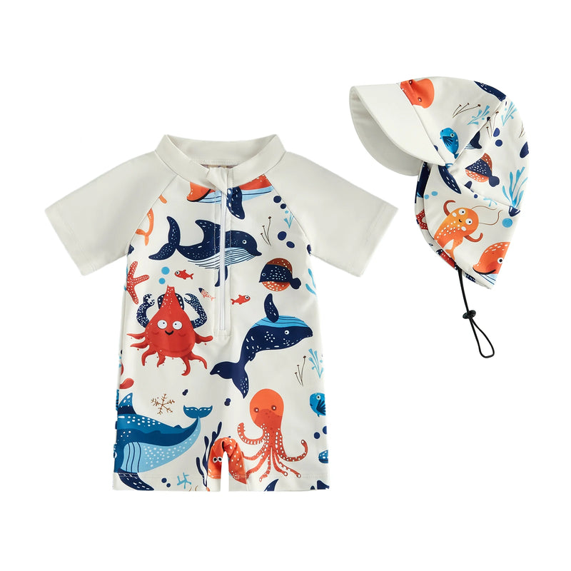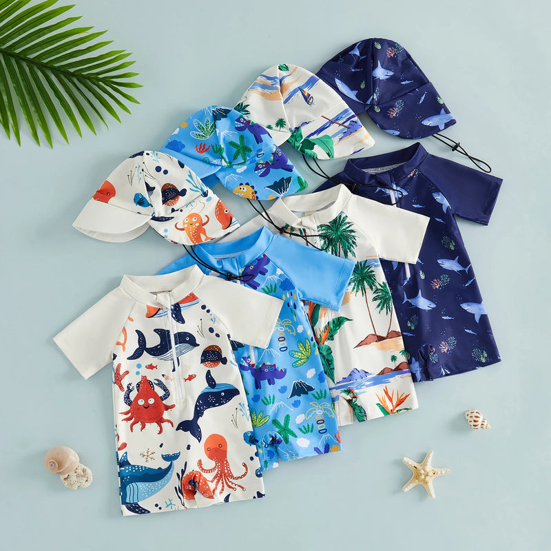 Your little swimmer will love this vibrant rash guard set with playful tropical and ocean-themed designs. Ideal for beach outings, pool time, water parks, and sunny getaways. Built to last through countless splashes and adventures, it keeps your baby boy comfortable and protected all season long.
