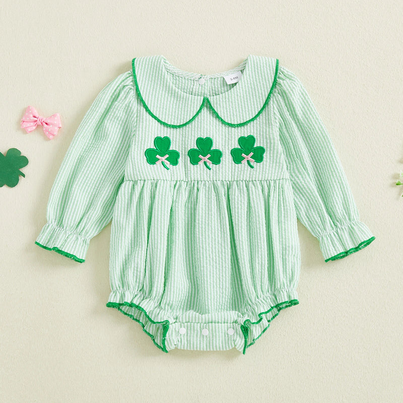 Get your little one dressed in style with our adorable romper! Featuring a lovely green collar and fun clover design, perfect for any occasion. With long sleeves for added warmth, your baby girl will stay comfy and cute all day long!