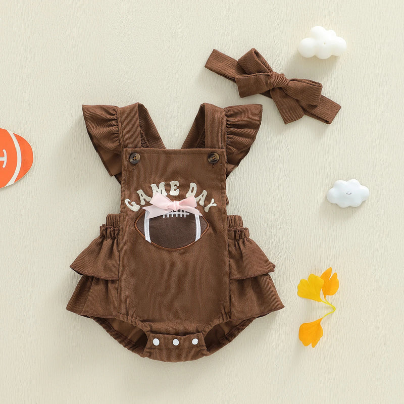 Featuring adorable ruffles and a comfy fit, our sleeveless romper is perfect for your little football fan as it combines cute style with game day spirit. Let your baby girl shine with playful charm while cheering on the team in this fun and stylish outfit.