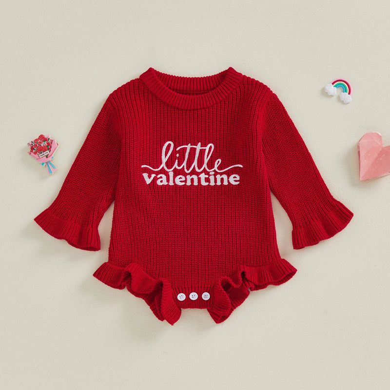Wrap your little one in warmth and charm with this delightful red knitted romper. Long sleeves and playful ruffles make it ideal for cozy days and Valentine's celebrations alike. A go-to piece for both everyday cuddles and picture-perfect moments.