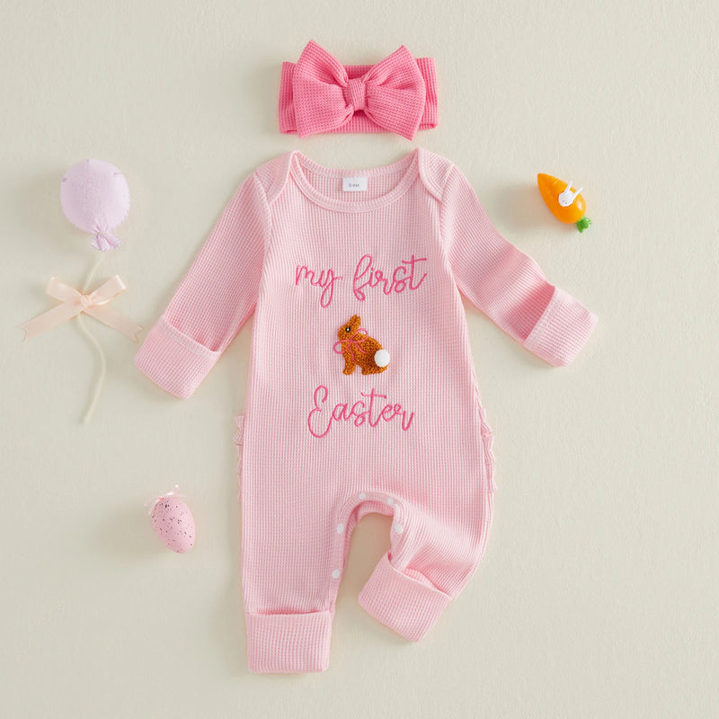 Make her first Easter unforgettable in this sweet ruffle jumpsuit. Soft pink and khaki colors with long sleeves and playful ruffles create the perfect festive look for photos and celebrations.