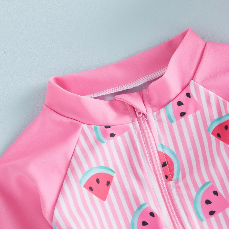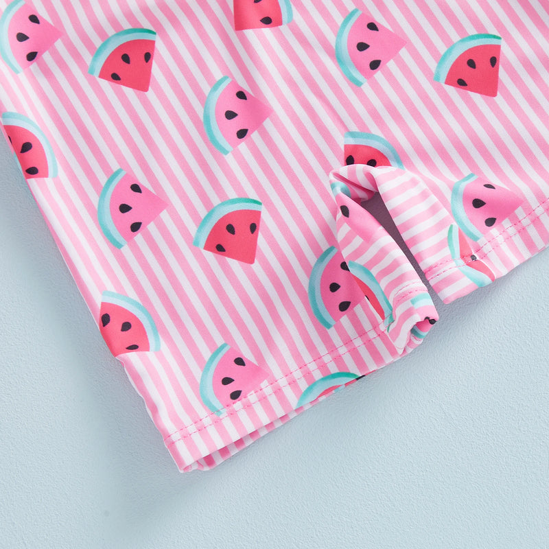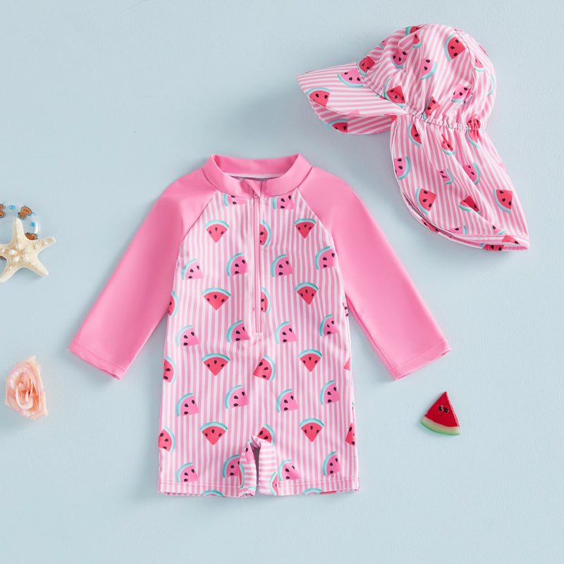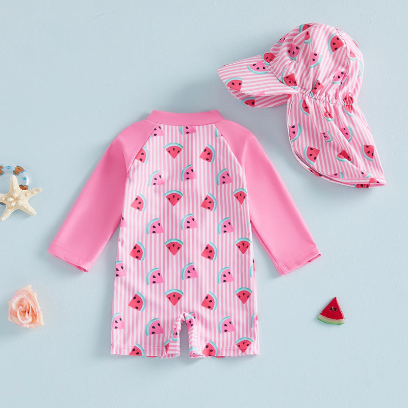 Give your little swimmer the perfect beach buddy with this striped swimsuit and matching sun hat duo. Let them pick their favorite from three cute designs: yellow bees, pink watermelon, or blue sharks. Made for comfort and complete sun protection during all their splashing adventures.