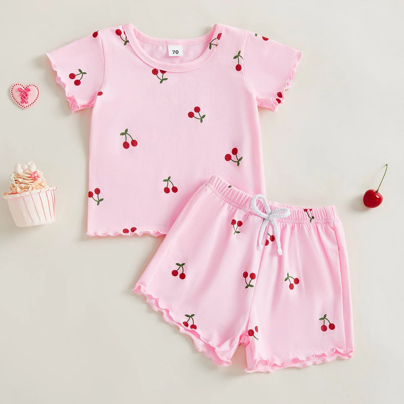 Let your little one bloom in this charming cherry-adorned outfit, perfect for warm days ahead. The soft top pairs beautifully with coordinating shorts, creating an effortlessly cute look that transitions seamlessly from summer through fall. Featuring playful cherry details that add a touch of whimsy, this two-piece set is designed to keep her comfortable and stylish during all her outdoor adventures.