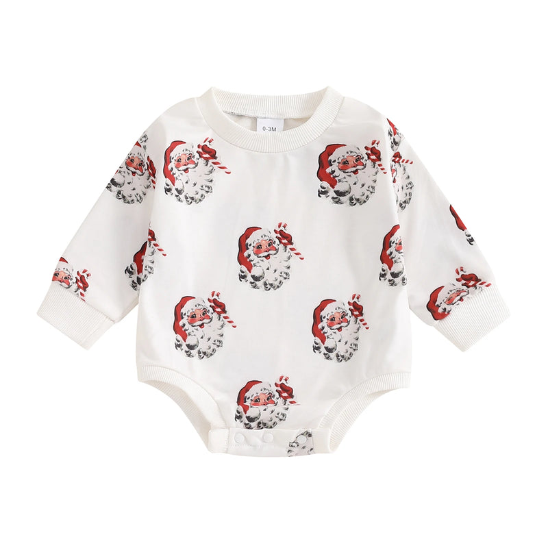 Dress your little one in festive cheer with this fun white long-sleeve onesie, decorated with an adorable vintage Santa design. Soft and snug, it’s just right for holiday snuggles and merry Christmas moments.