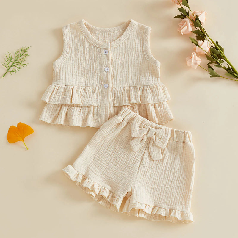 A sweet and stylish outfit for your baby girl that features adorable ruffles and bowties ideal for summer wear. It's designed to keep her comfortable while looking absolutely precious.